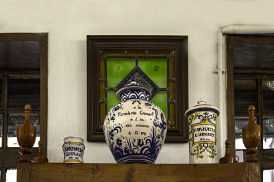 Es conserven exposats molts estris de laboratori , especialitats antigues , pots de vidre amb tap de vidre esmerilat , i molts documents .